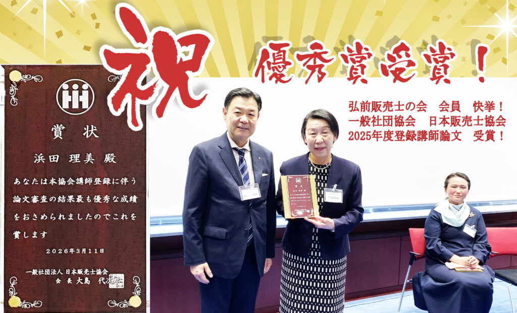 2026年3月14日弘前販売士の会 会長 浜田健三 平素より大変お世話になっております。さて、このたび当会会員 浜田理美 の論文が、一般社団法人日本販売士協会主催「登録講師論文」におきまして優秀賞を受賞致しましたのでここに謹んでご報告申... -